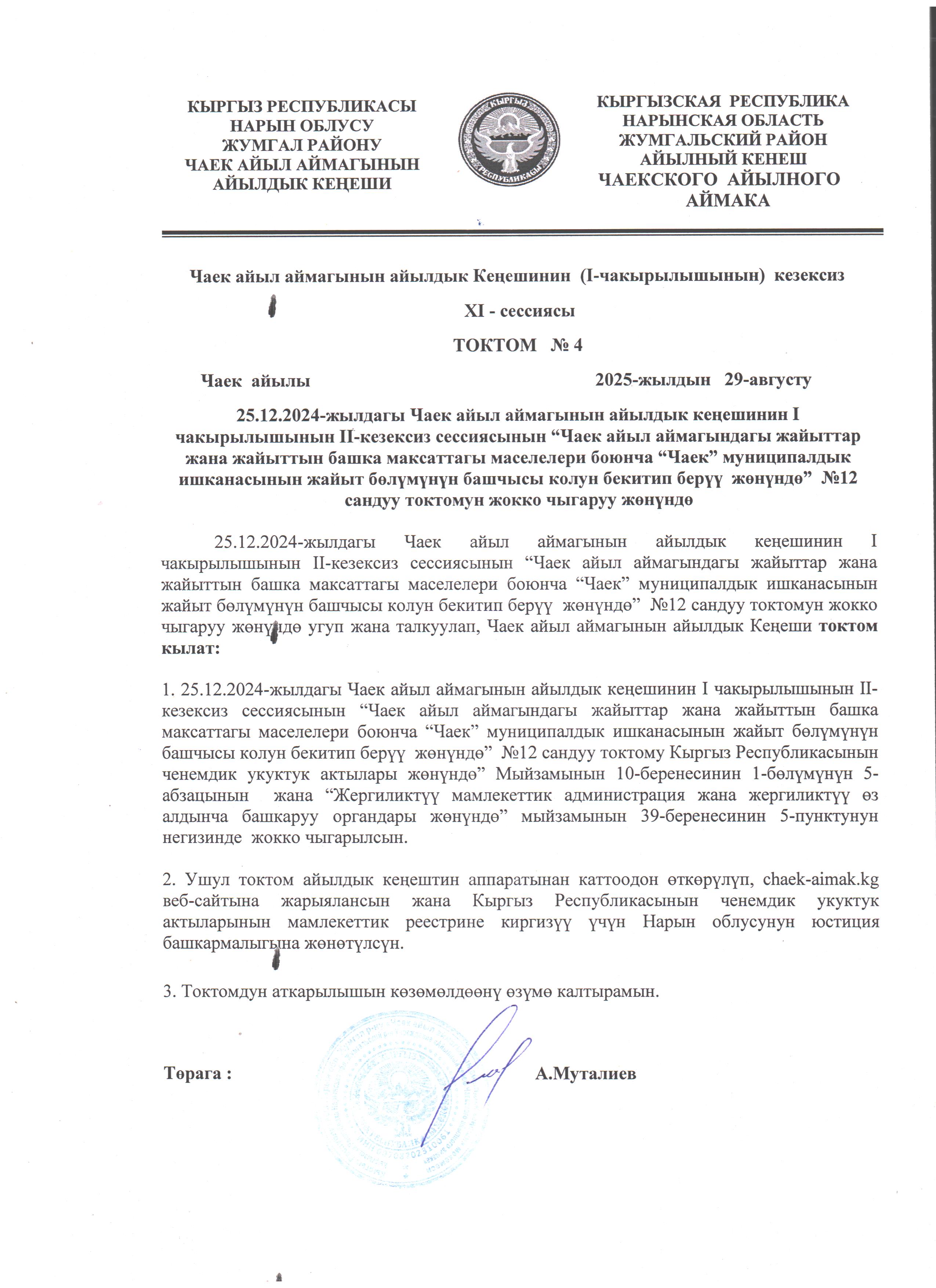 25.12.2024-жылдагы Чаек айыл аймагынын айылдык кеңешинин I чакырылышынын II-кезексиз сессиясынын “Чаек айыл аймагындагы жайыттар жана жайыттын башка максаттагы маселелери боюнча “Чаек” муниципалдык ишканасынын жайыт бөлүмүнүн башчысы колун бекитип берүү жөнүндө” №12 сандуу токтомун жокко чыгаруу жөнүндө