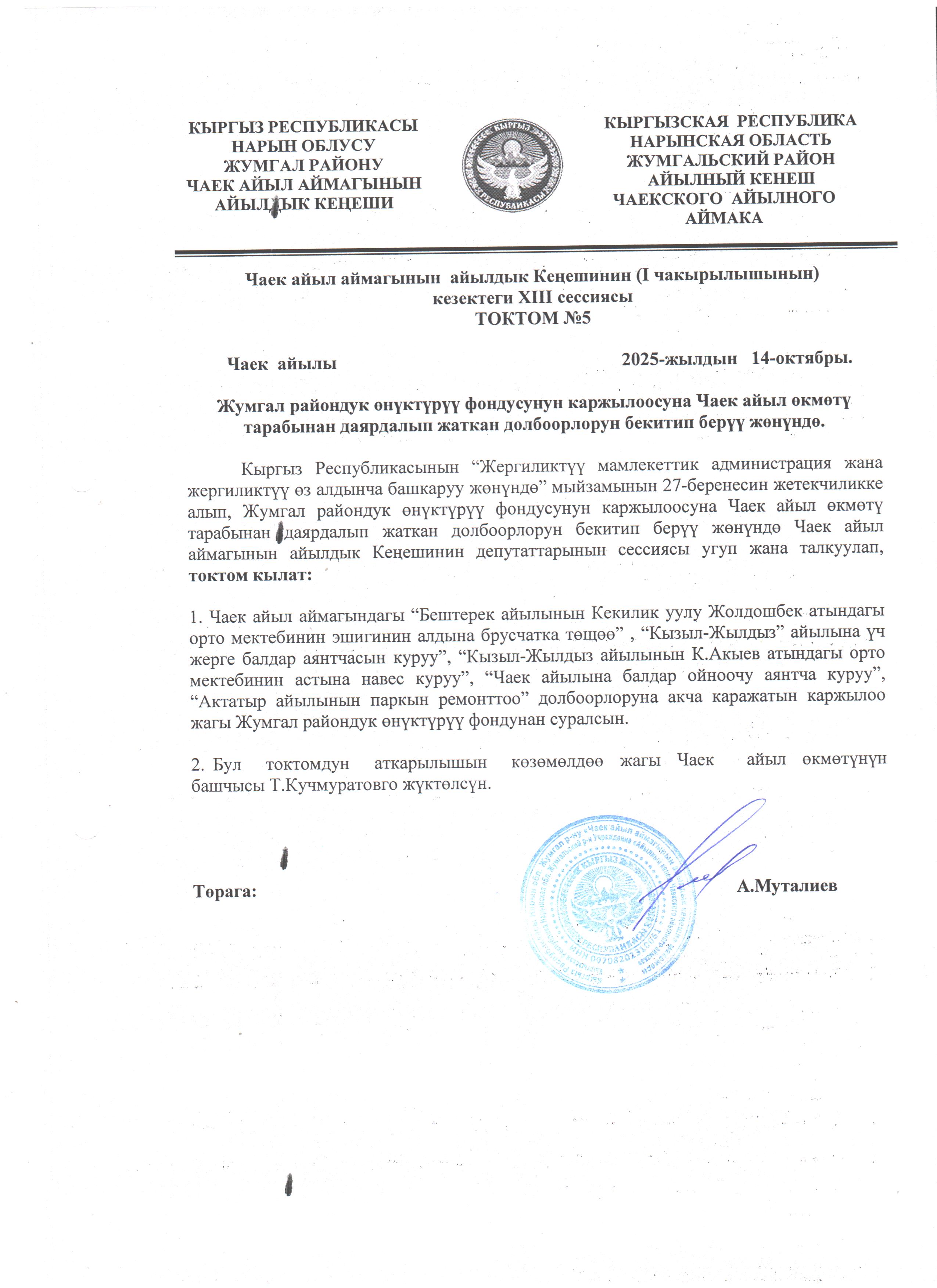 Жумгал райондук өнүктүрүү фондусунун каржылоосуна Чаек айыл өкмөтү тарабынан даярдалып жаткан долбоорлорун бекитип берүү жөнүндө.