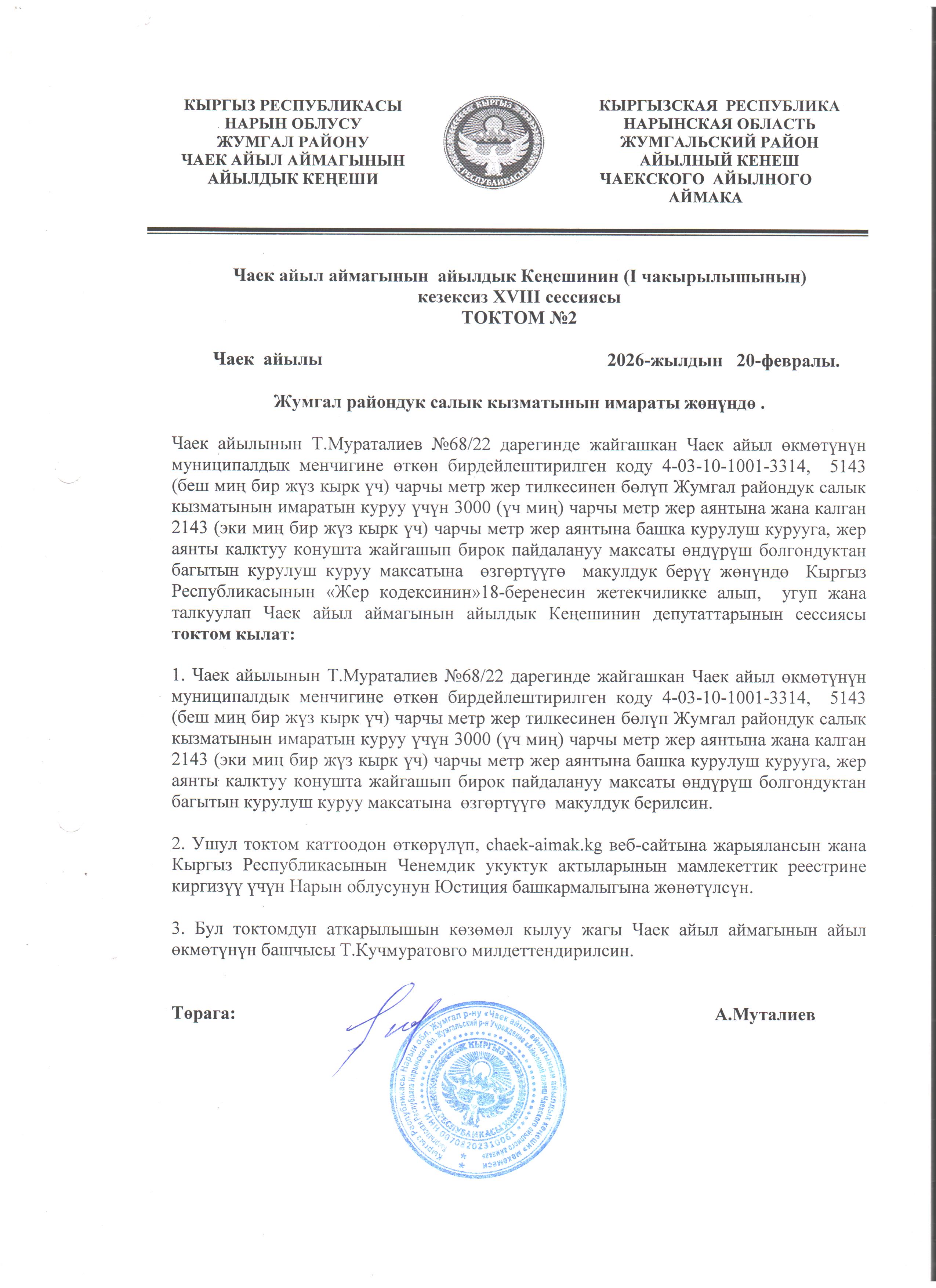 Чаек айыл аймагынын айылдык Кеңешинин (I-чакырылышынын) кезексиз XVIII - сессиясы ТОКТОМ №2