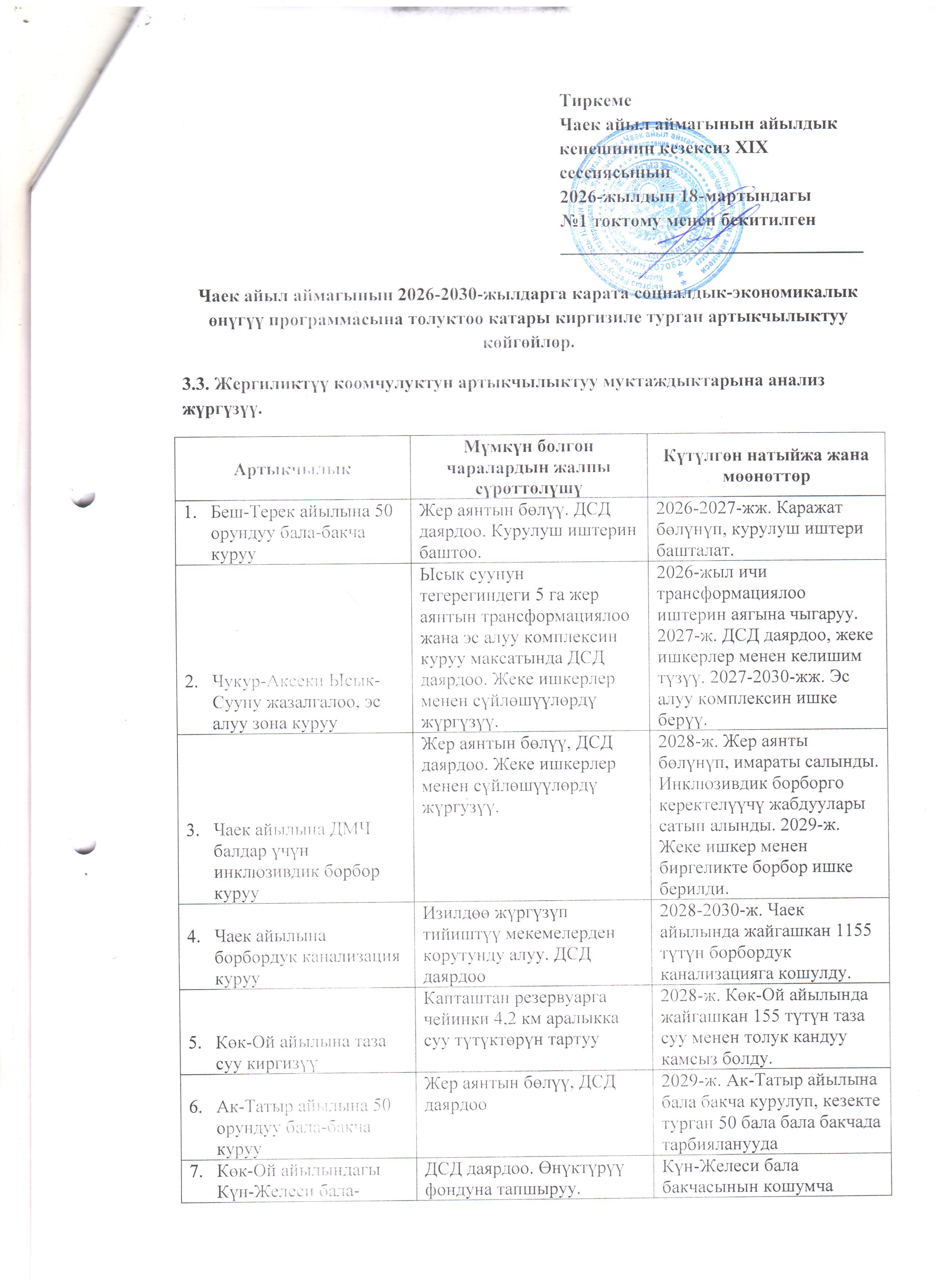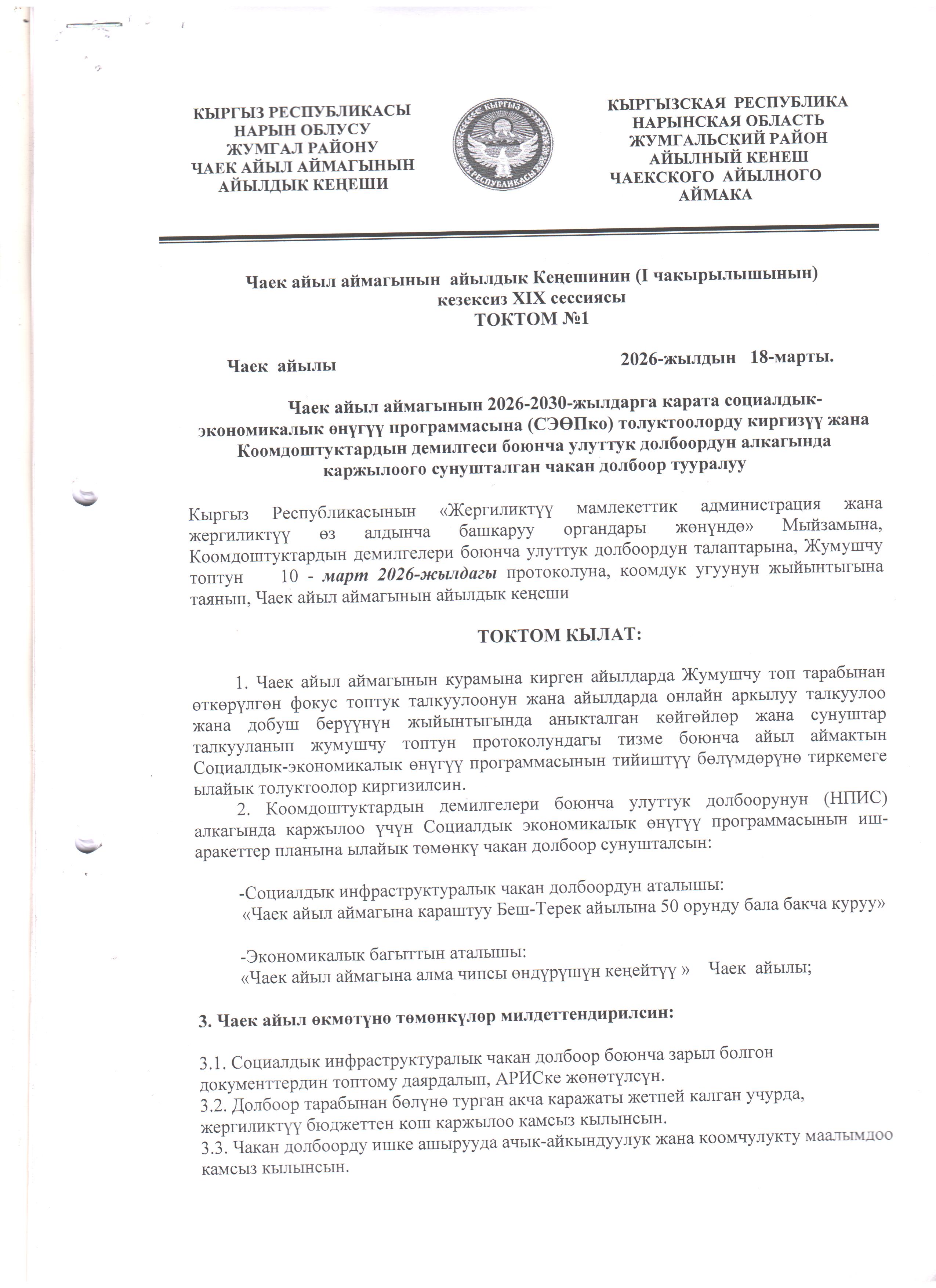 Чаек айыл аймагынын айылдык Кеңешинин (I-чакырылышынын) кезексиз XIX сессиясы ТОКТОМ №1
