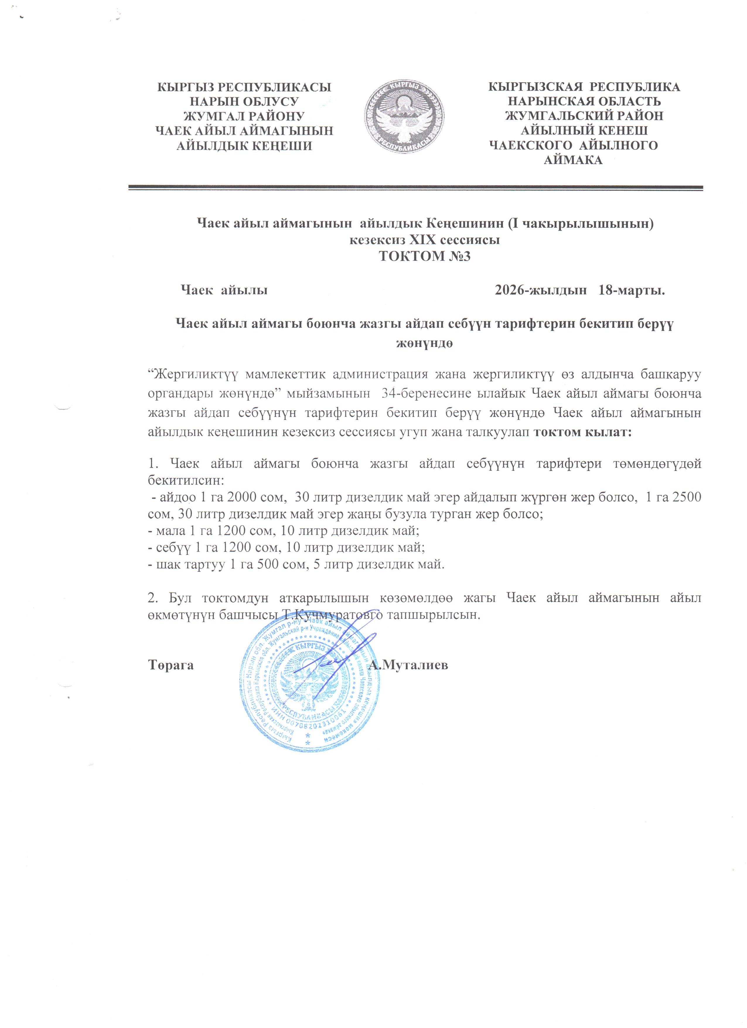 Чаек айыл аймагы боюнча жазгы айдап себүүн тарифтерин бекитип берүү жөнүндө