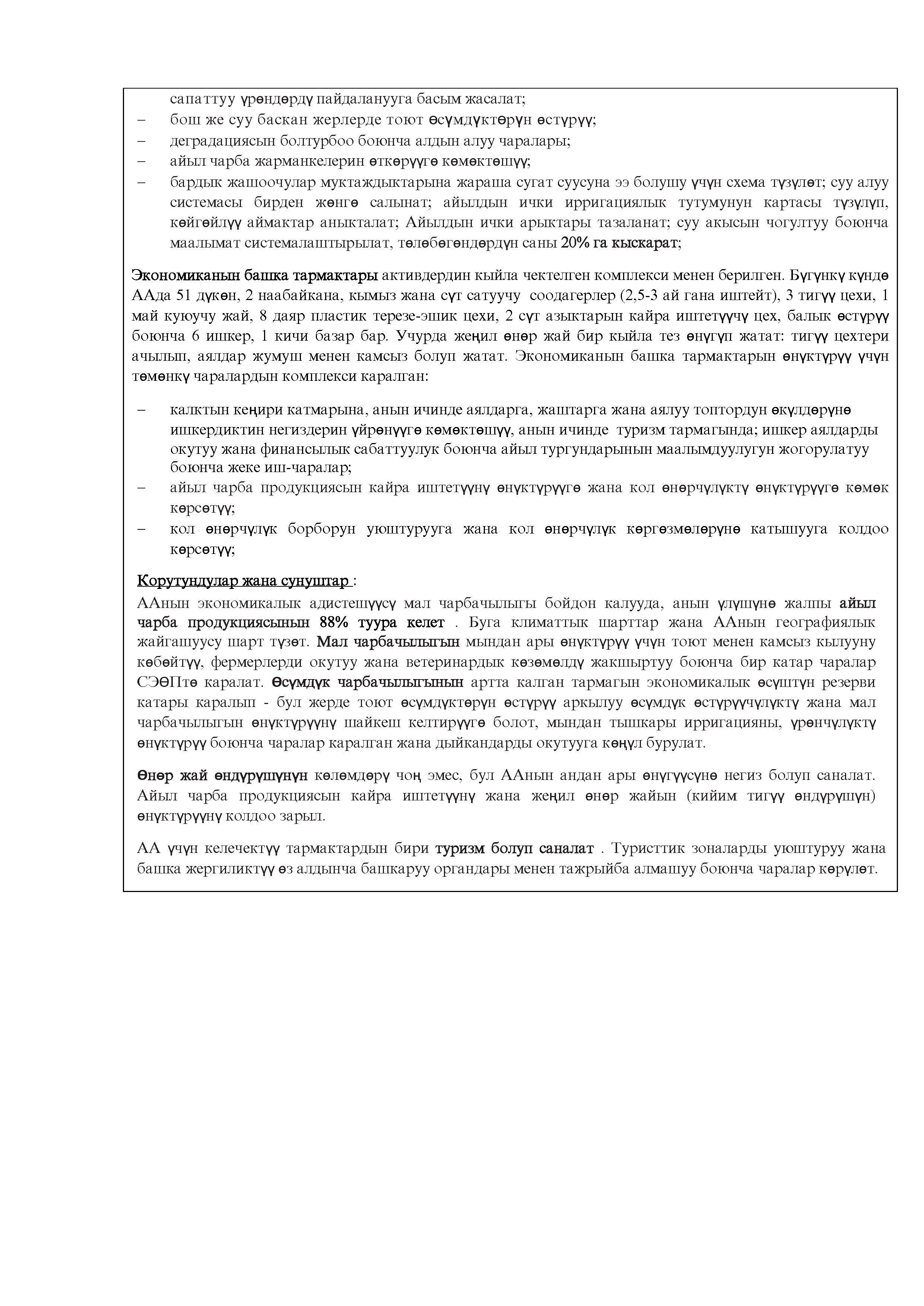 | Айыл чарба жерлеринин түшүмдүүлүгүн жогорулатуу | Чаек айыл аймагында эрежелерди колдонуу менен айыл чарба жерлеринин түшүмдүүлүгүн жогорулатуу (экологиялык, органикалык, минералдык жер семирткичтерди колдонуу) | ||||||||||